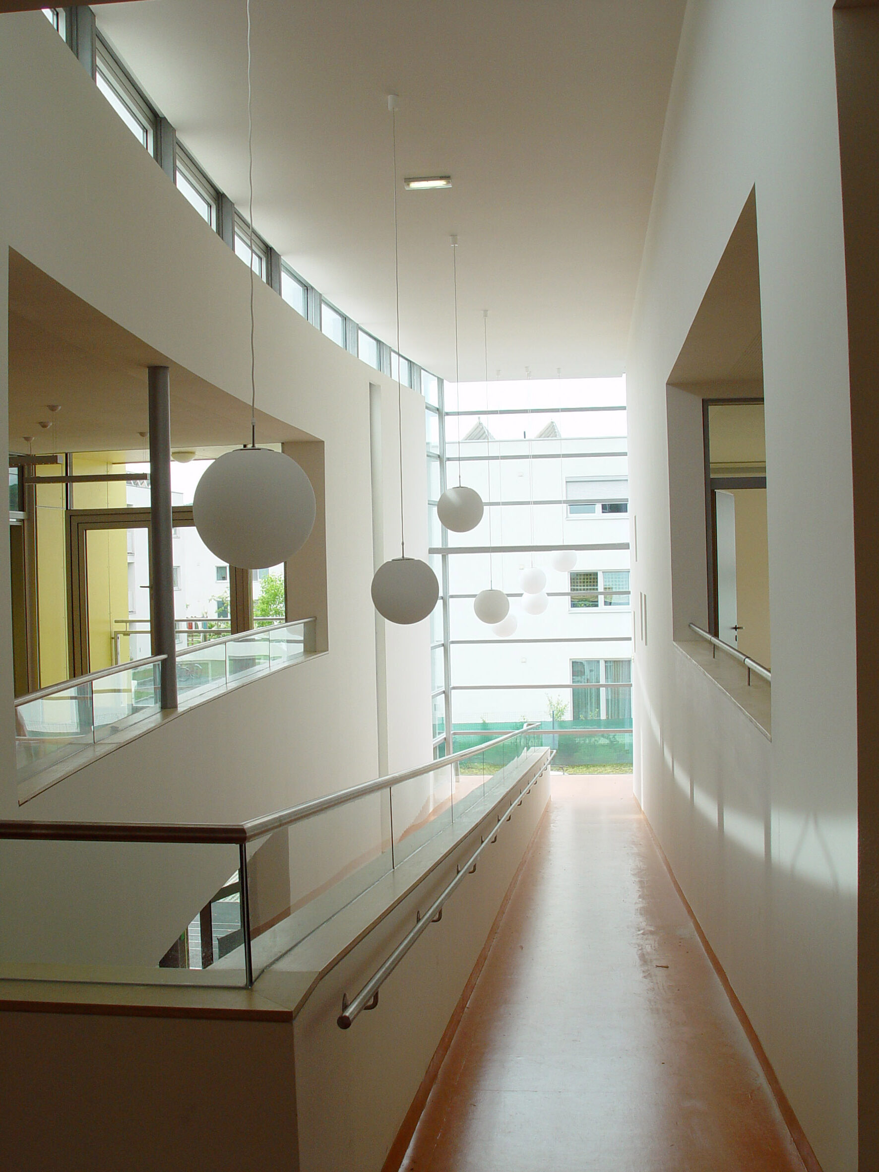 Hohe Transparenz und Durchgängigkeit erlauben interessante Ein-, Aus- und Durchblicke, erleichtern die äußere und innere Orientierung und geben dem Gebäude die Offenheit, die es benötigt, um den pädagogischen Ansatz eines „offenen Kindergartens verwirklichen zu können.