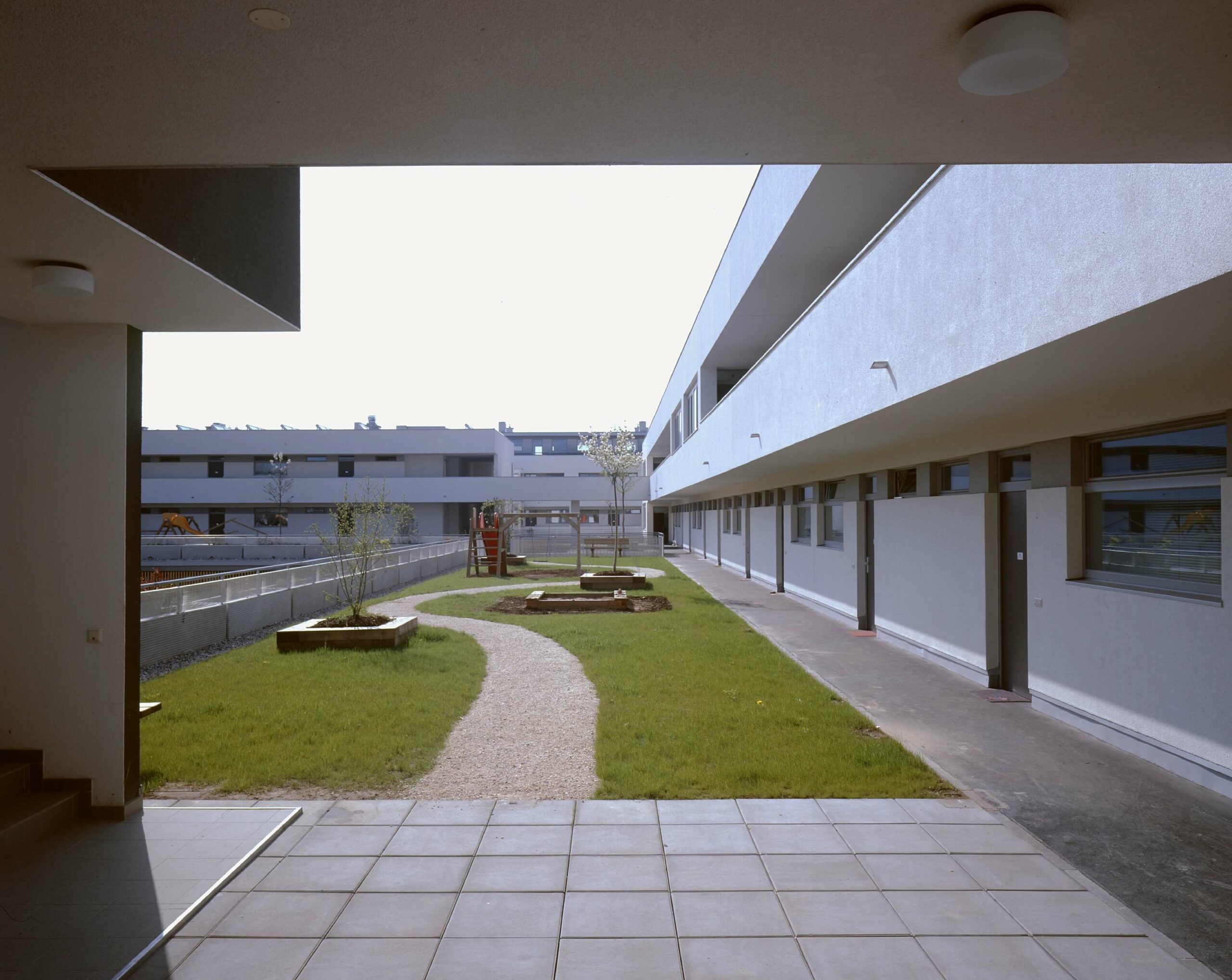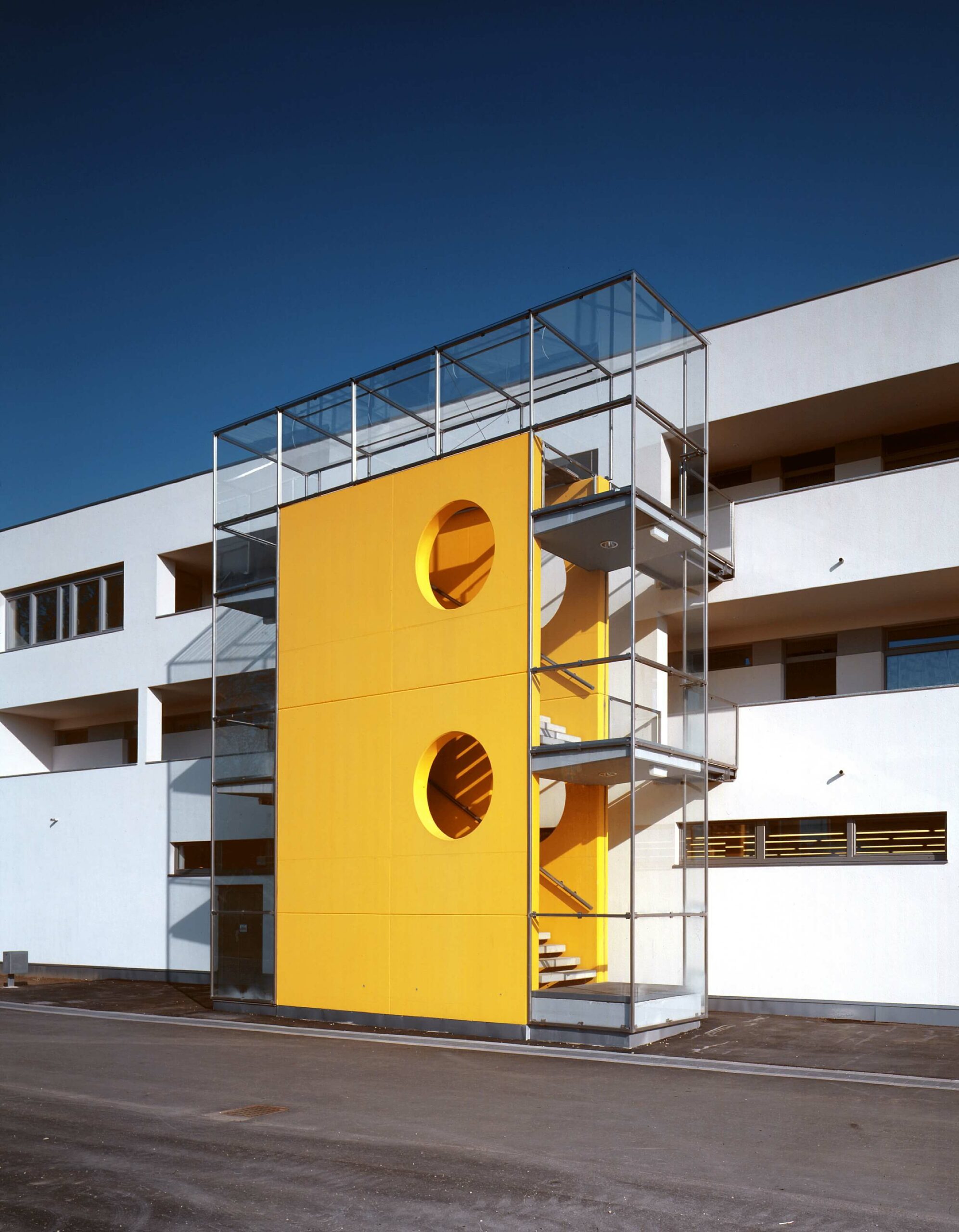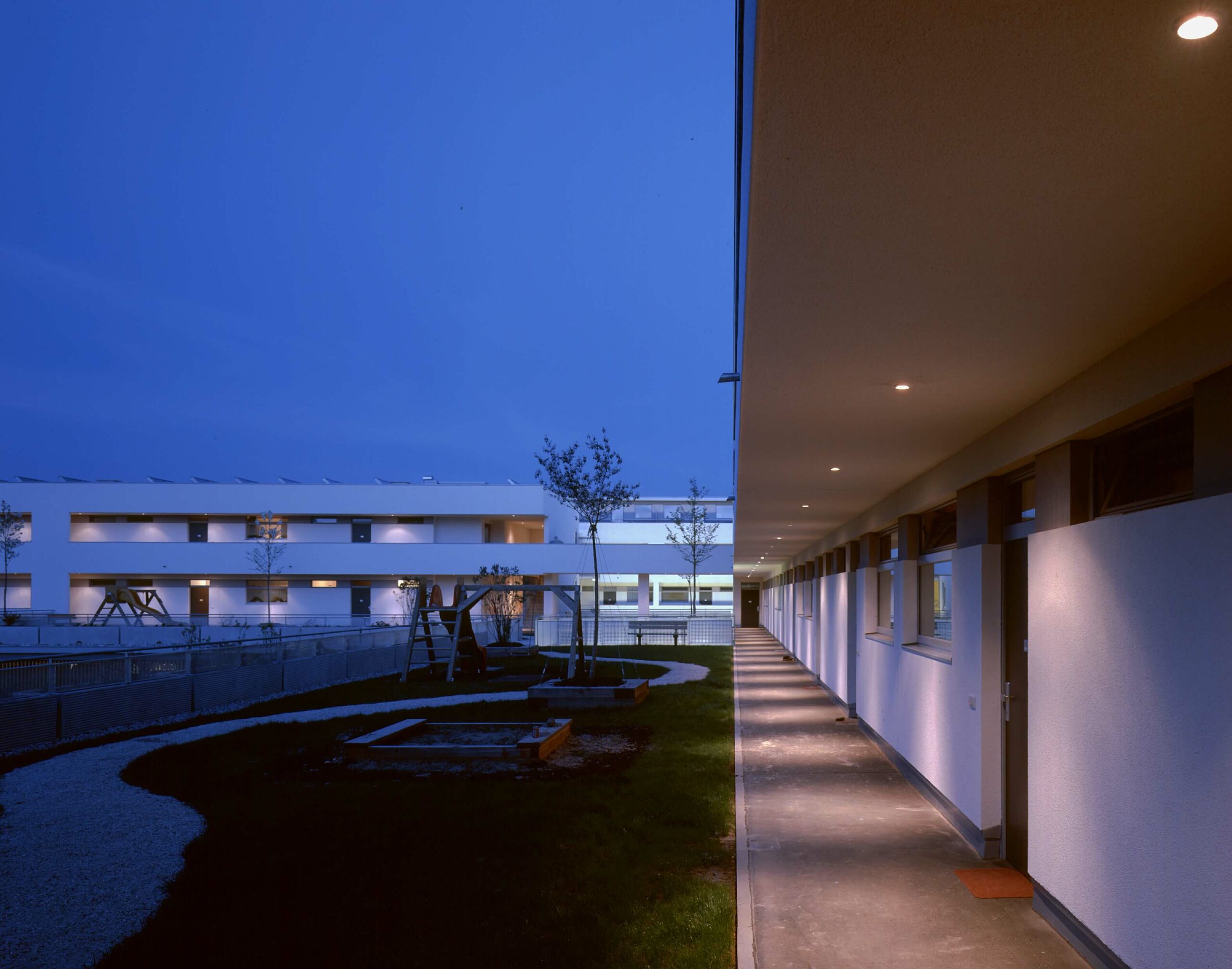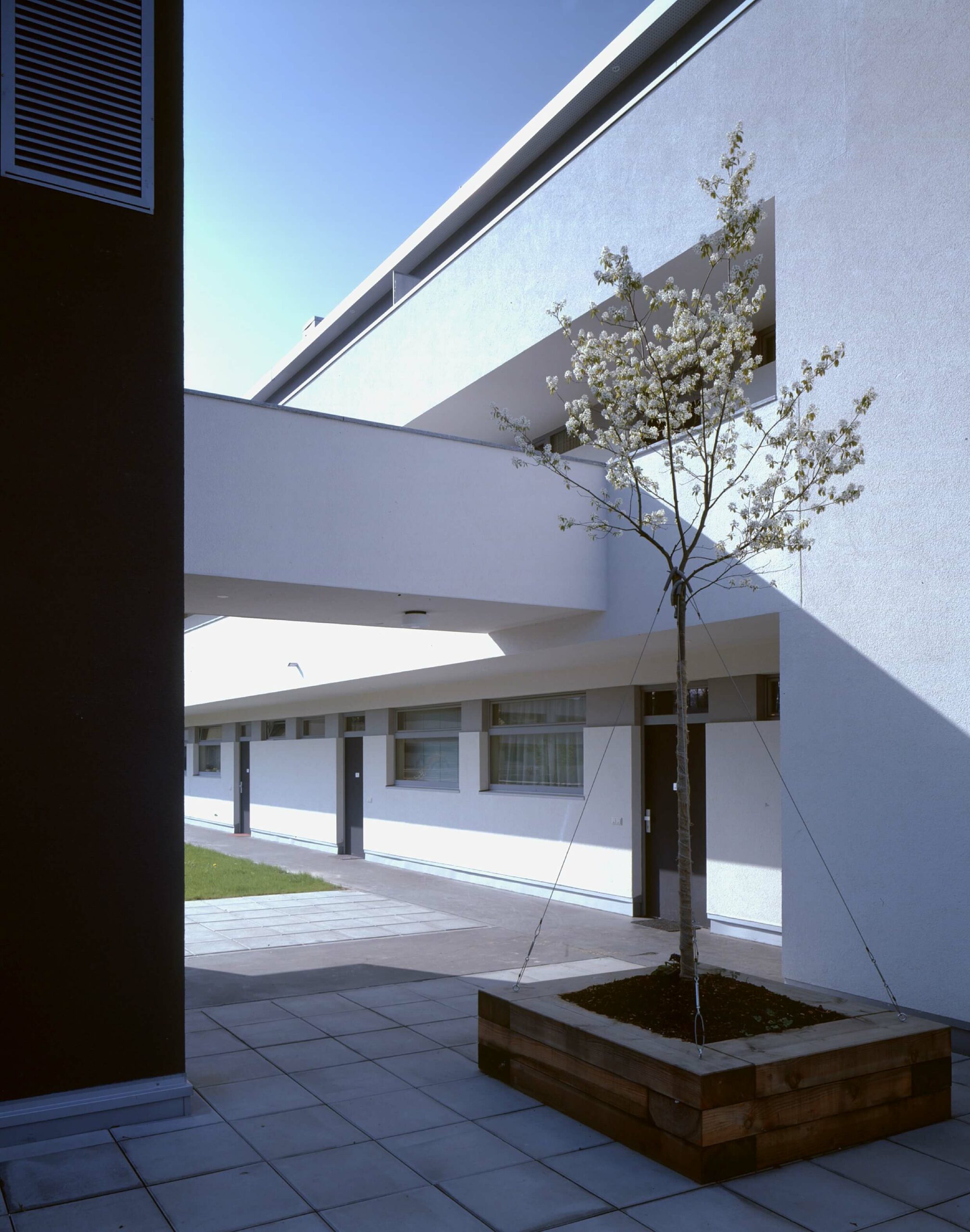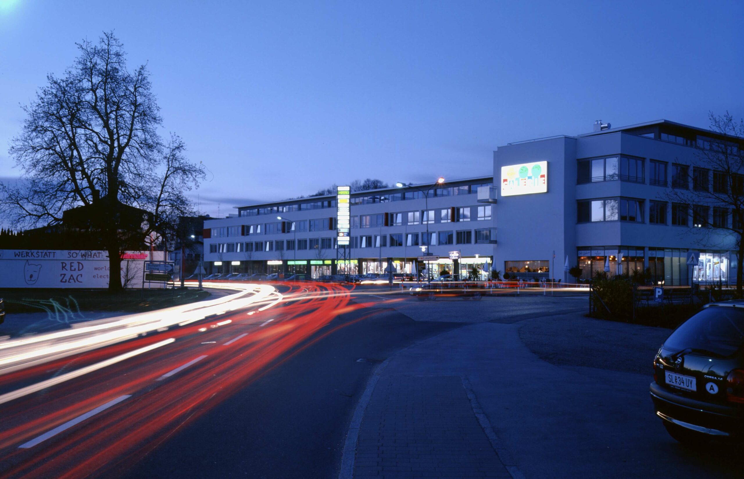 Dienstleistungszentrum in lebendiger Durchmischung mit Wohnungen und Sporteinrichtungen als „Missing Link“ im Gefüge einer Kleinstadt. Die Fronten des Geschäfts- und Dienstleistungszentrum spannen mit der vorhandenen Bebauung eine neue Platzsituation an der Hauptstrasse auf.